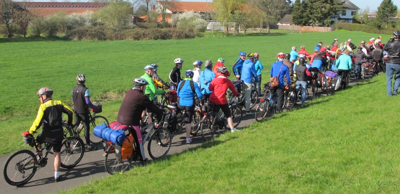 | 5. Tag Steinmeditation an der Elbe bei Hohnstorf, gegenüber von Lauenburg | 6. Tag: Gemeinsam radeln 120 Radpilger von Marschacht weg |