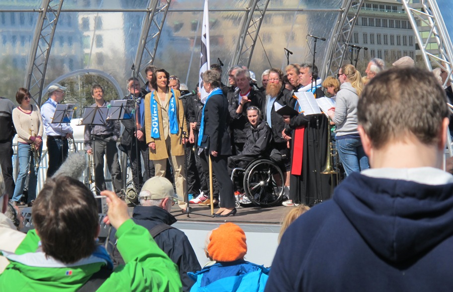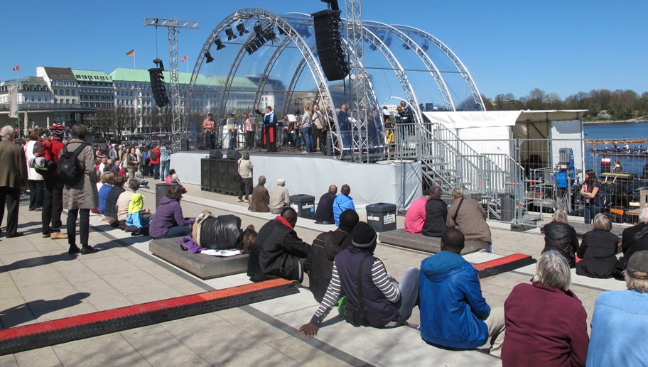 | Bootspilger werden auf der Bühne begrüßt am Jungfernstieg | Die Rappenbügler Radpilger am Jungfernstieg |