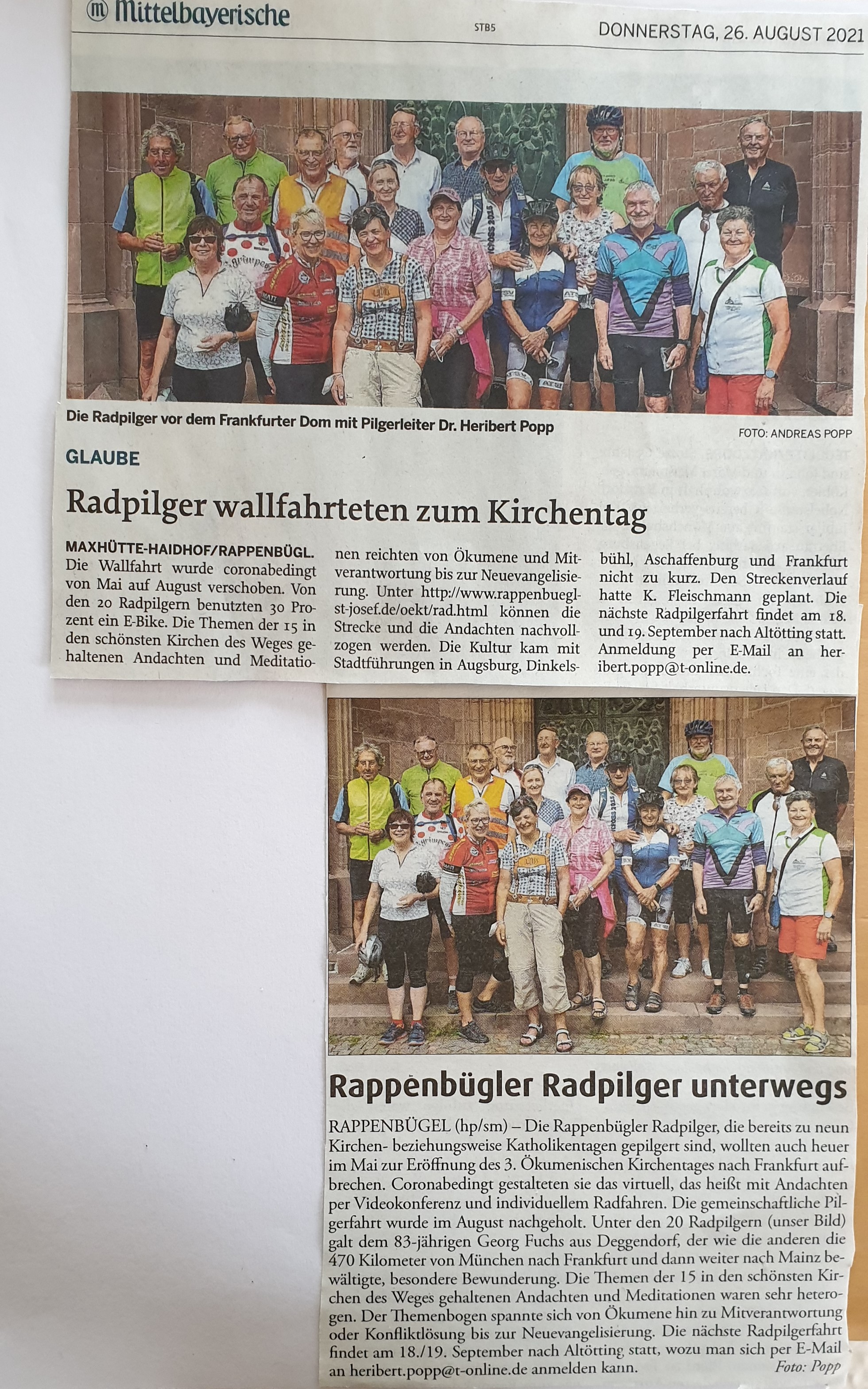 7. Radpilgerfahrt 6.-14.8.2022 Marienwallfahrtsort Marija Bistrica (Kroatien) ((670 km und 4000 Hm) und Buspilgerfahrt weiter nach Dechtice (Slowakei) und Marienerscheinungsort Philippsdorf (Tschechien) Programm) Kurzer Bericht mit Gruppenfoto; 20-seitiger E-Book-Beitrag darüber, 8. 23.8.-1.9. 4 anerkannte Marienerscheinungsorte in Frankreich und Belgien sowie Taize (670 von 770km, 5800 Hm von 7000 Hm)Programm für (670 von 770km, 5800 Hm von 7000 Hm) Kurzer Bericht mit Gruppenfoto in MZ;Gruppenfoto in Paris 27-seitiger E-Book-Beitrag darüber, 9. 27 malige Radpilgerfahrt nach Altötting (je 161 km und 1210 Hm) 1999-2025; Bericht darüber aus dem Rappenbügler Radpilger-Buch, Chronologie der Teilnehmergruppen; |