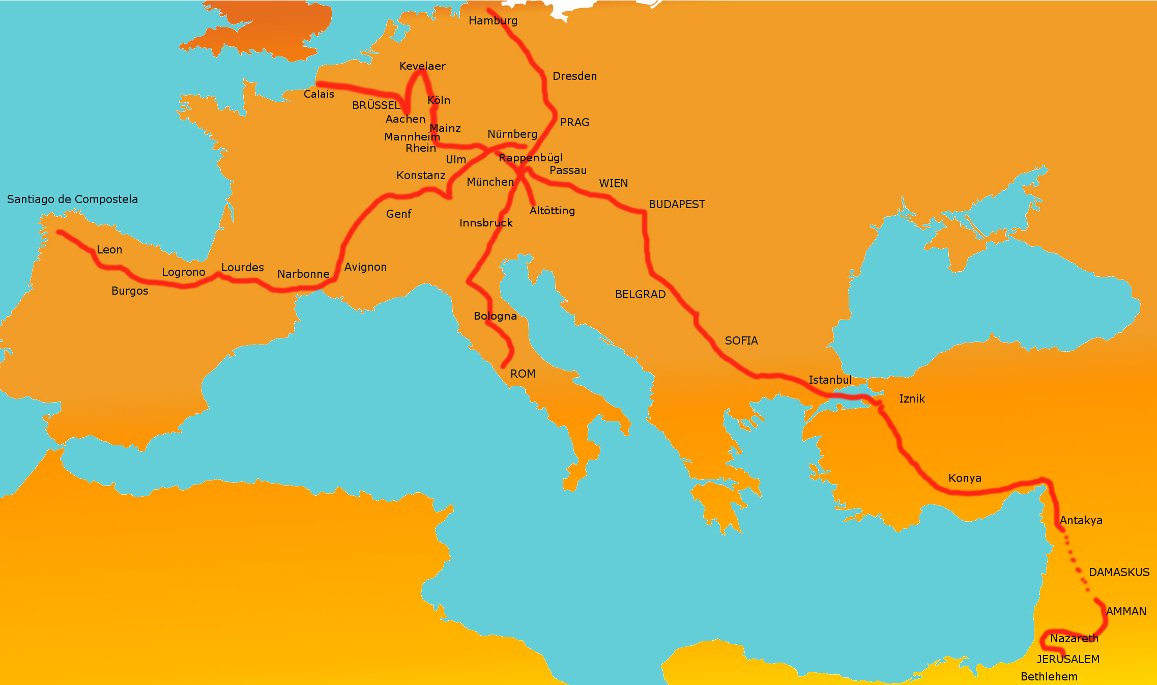 Die rot eingezeichneten Routen sind die Rappenbügler Radpilger schon gefahren: Santiago, Rom, Hamburg und über Istanbul nach Jerusalem; es fehlt die Route nach Calais und dann durch Südengland und Westirland nach Bangor Abbey
