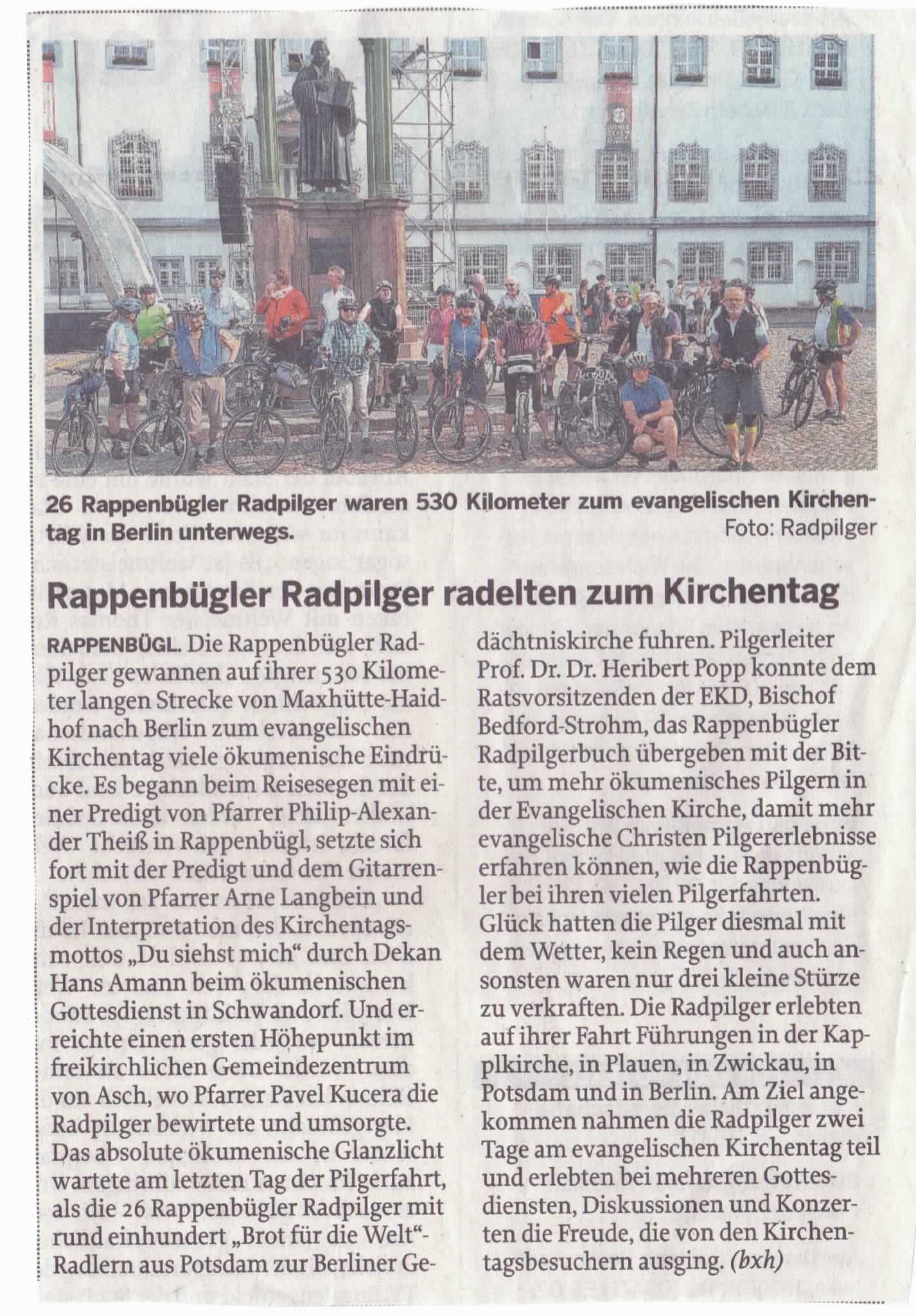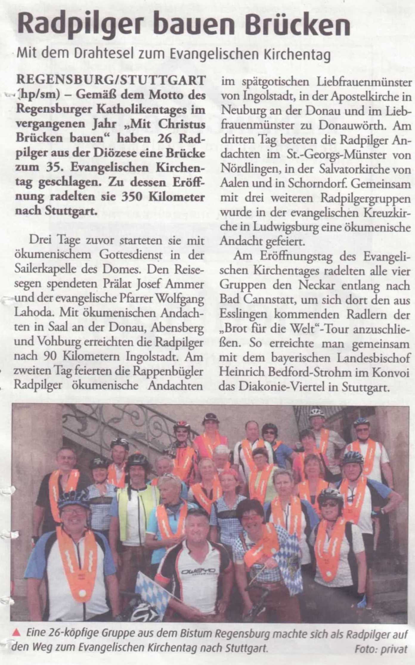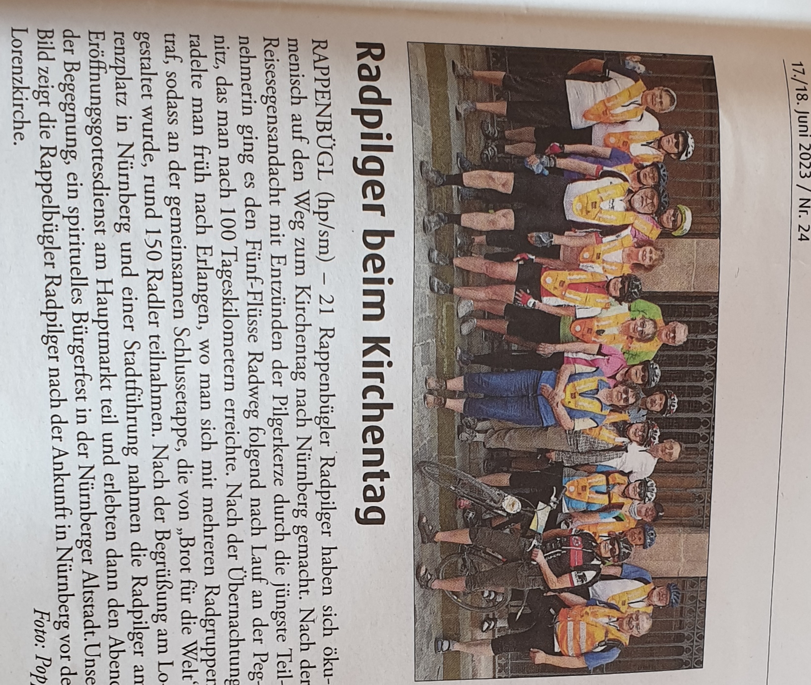 Bei den Radpilgerfahrten brennt immer vor dem Pilgerpatron St. Jakobus (man beachte den Radlenker als Ende des Pilgerstabes) eine Pilgerkerze als Zeichen, dass ein Teil der Pfarrei auf Pilgerschaft ist. Am 1.12.15 ist das von den Radpilgern auf ihren 9980 km einfach und 380 000 km gemeinsam Erlebte in Buchform erschienen. Da es vergriffen ist, wird an der 2. Auflage in E-Book-Form gearbeitet Rappenbügler Radpilger auf YouTube Die Andachten beten die Radpilger aus diesem Spirituellen Pilgerbegleiter Folgende Radpilgerfahrten führte die Pfarrei 2025 durchzuführen: Zum evangelischen Kirchentag nach Hannover 26.4.-1.5.2025 27. Mal nach Altötting 24.-25.5.2025 Folgende Radpilgerfahrten führte die Pfarrei durch: 1. Radpilgerfahrt von Regensburg in 2287 km nach Bangor Abbey in Nordirland, den Ursprung der Missionierung Süddeutschlands 2014, 2017 und 2018