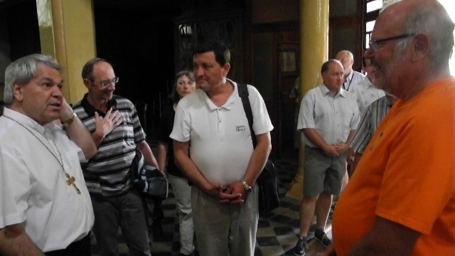 | Erste ökumenische Erlebnis brachte die Begegnung mit dem orthodoxen Pater Plamen aus dem Ort Dolna Banja. Er führte uns zu einer neu errichteten Kirche und stellte seine Pfarrei vor. Wir durften dort eine Andacht zum Thema „Zeit ist Leben“ feiern und beteten gemeinsam das "Vater unser" | Gespräch mit dem Kath. Bischof Georgi Jovtschev (li.) in seiner Kathedrale in Plovdiv u.a. über den schweren Stand der Ökumene in Bulgarien, wo die orthodoxen Würdenträger die Katholiken als Häretiker sehen |